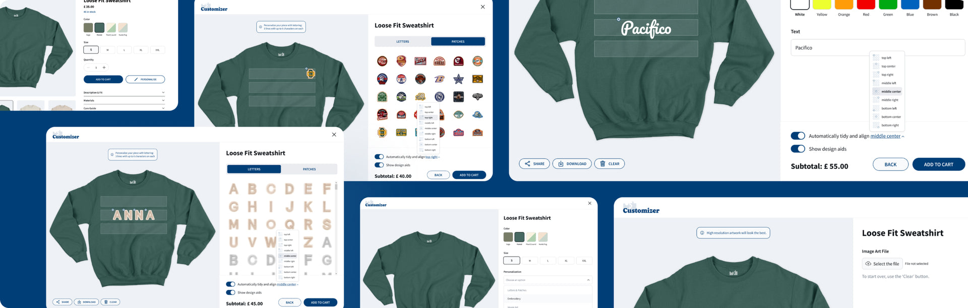 — Add Letters/Patches: This option enables customers to personalize products with letters (like initials or acronyms) or patches (such as badges or emblems). The SVG lines serve as guides to help users position these elements accurately on the product image, allowing them to visualize their customizations before finalizing their order.