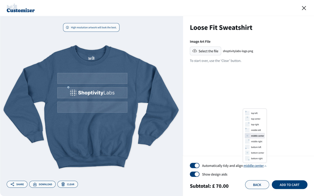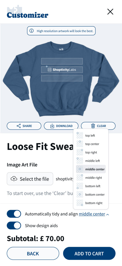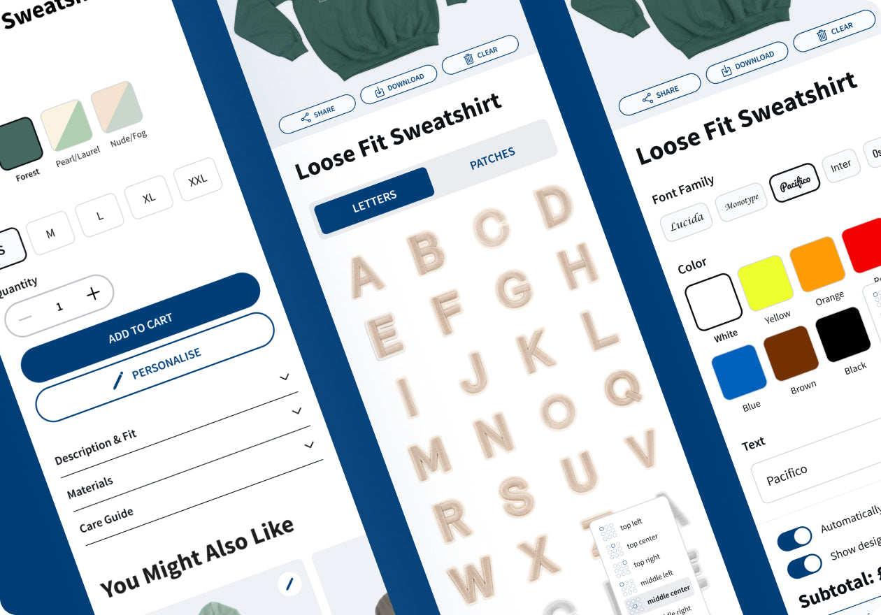 — Share/Download/Clear: Once the customization process is complete, users have the option to share their unique design, perhaps with friends or on social media, to get feedback or to show off their creativity. The download option typically allows the customer to save an image of their personalized product. If the user isn't satisfied with the design, the 'Clear' button resets all selections, allowing them to start the customization process from scratch.